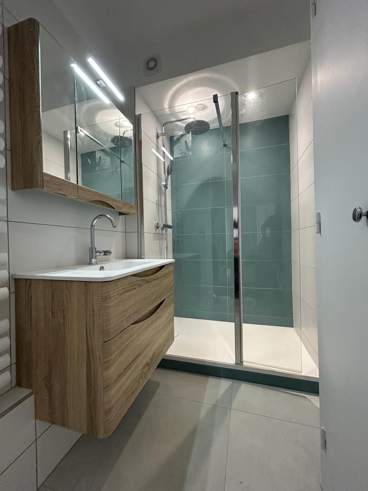 Salle de bain au Havre avec double vasque, cabine de douche et baignoire